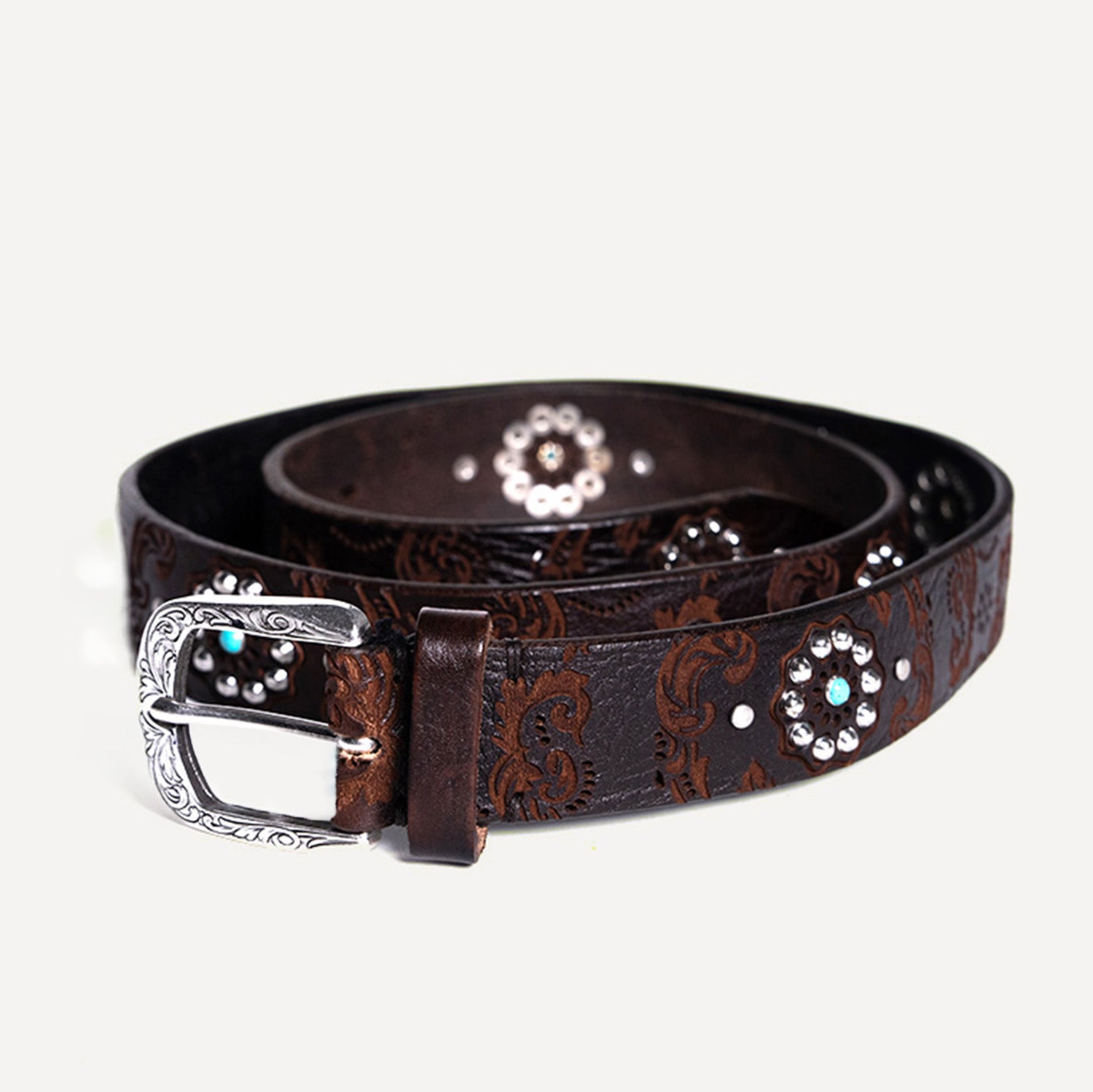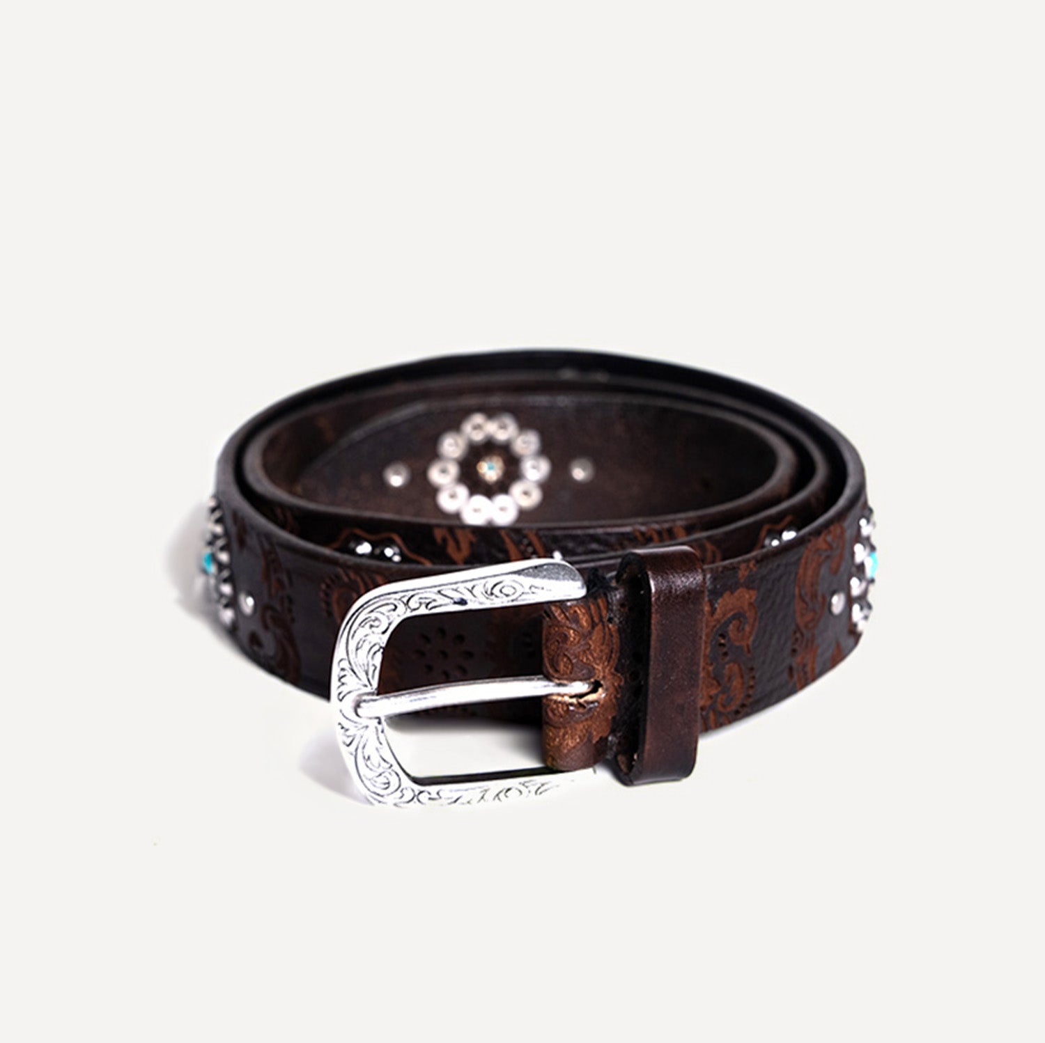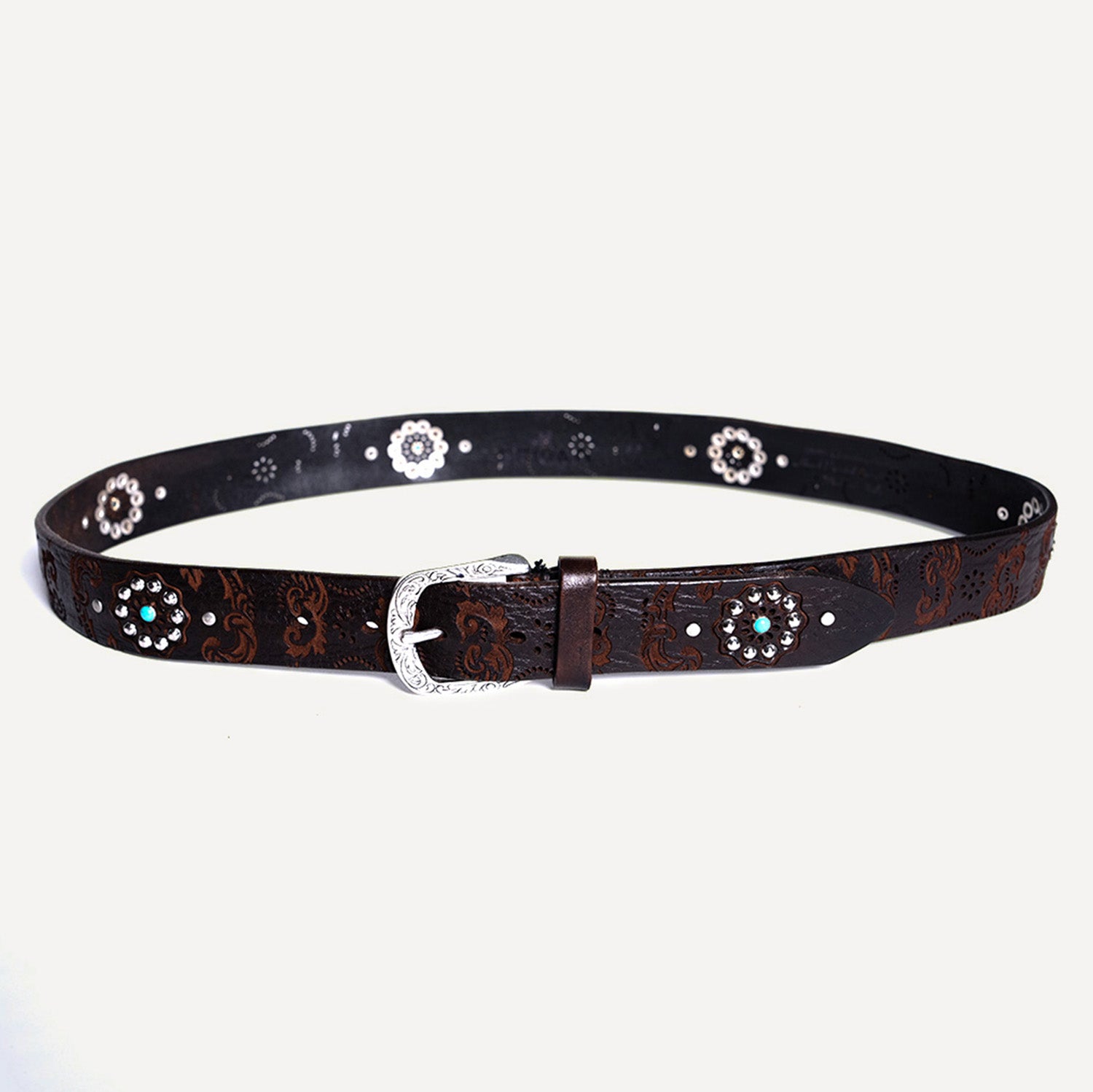 Our belts are crafted from carefully selected, premium materials by skilled artisans. The Alpina belt, made from authentic Italian leather, is adorned with jade studs along its entirety, as well as intricate silver floral details and engraved leather, adding a touch of Italian elegance.