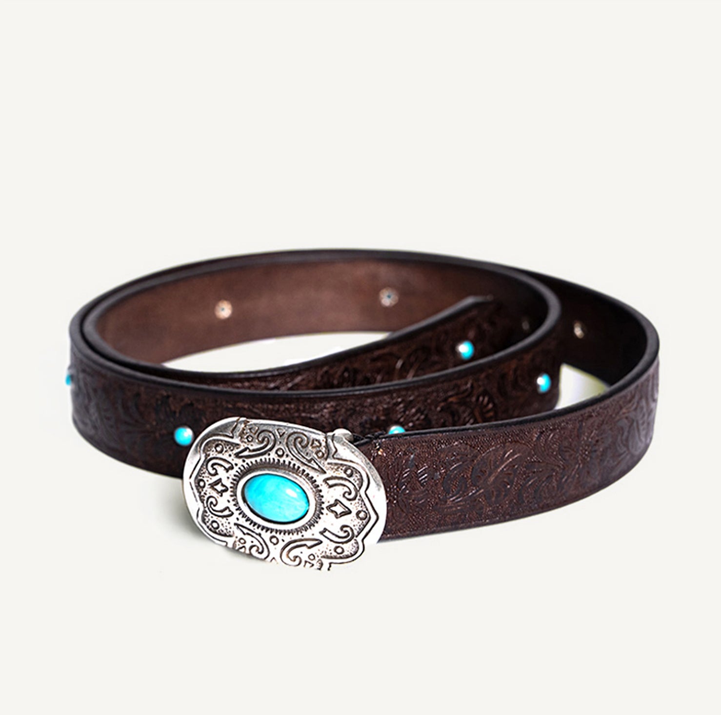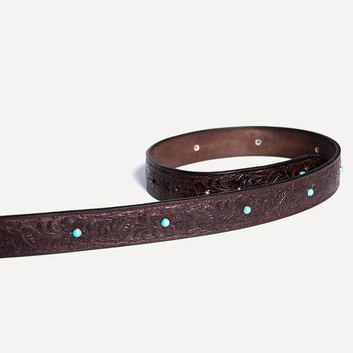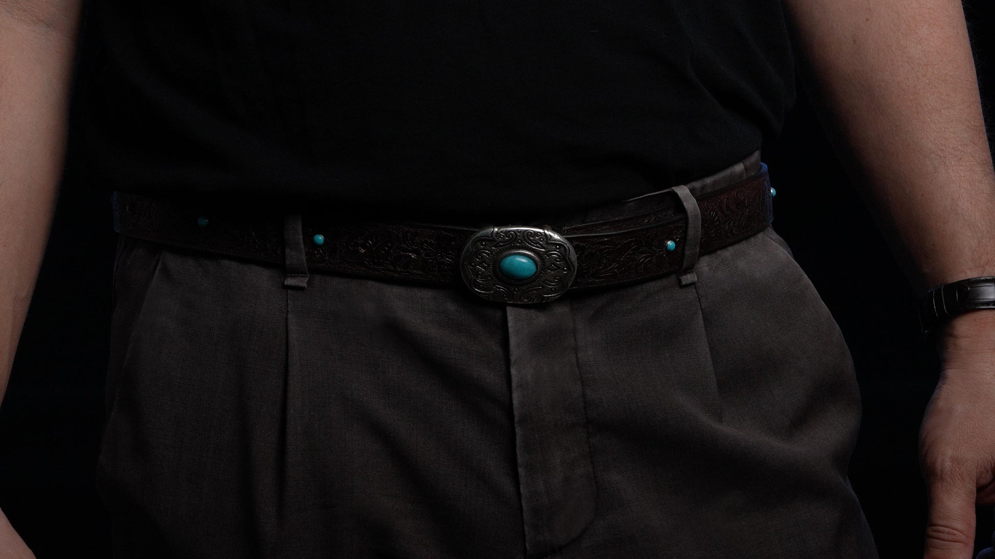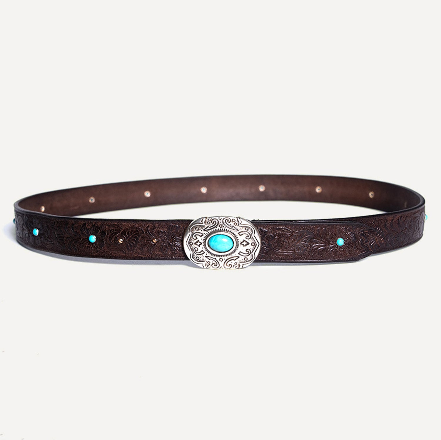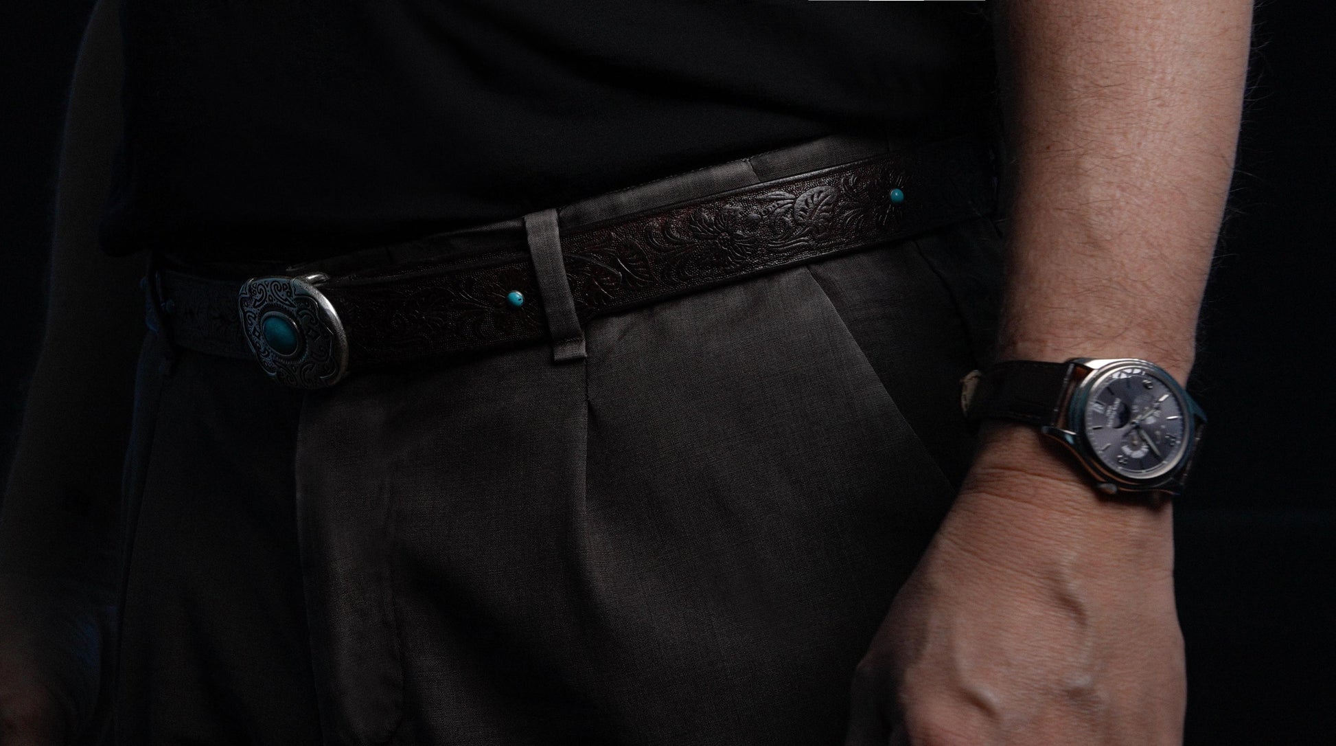 Embodying rugged elegance, the Brigati Butteri Belt celebrates a thousand-year-old Italian tradition with intricate leather embossing, turquoise accents, and an ornate silver buckle inspired by the coastal fields and the enduring spirit of Italy's legendary cowboys.